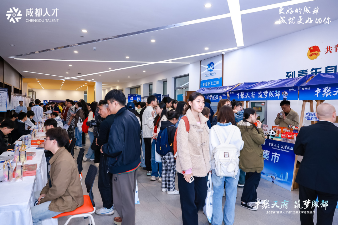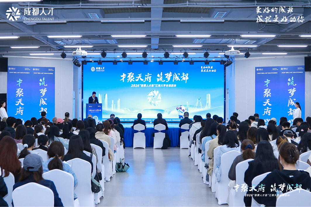4月14日,记者获悉,由成都市委人才办主办的“才聚天府·筑梦成都”——2026“蓉漂人才荟”江南大学专场活动日前在无锡举行。活动以“更好的成都,成就更好的你”为主题,精准链接江南大学青年人才,搭建校地人才互通、产才融合的坚实平台,校地嘉宾、企业代表与青年学子齐聚一堂,共话发展、共赴未来。